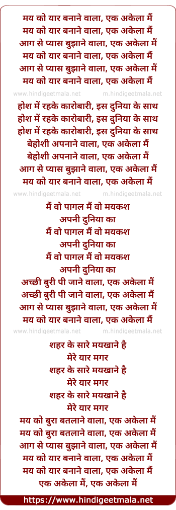 Lyrics of Ek Akela Mai - मय को यार बनाने वाला, एक अकेला मैं