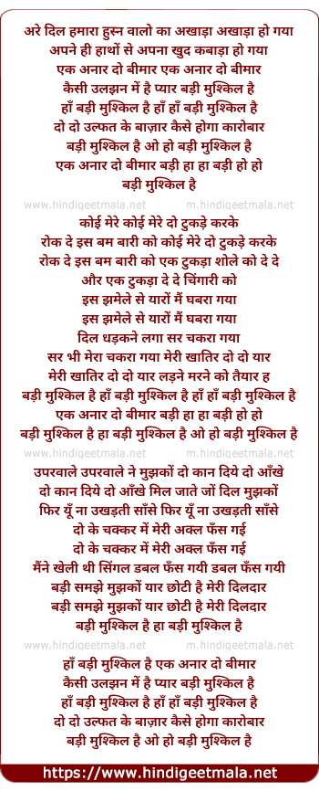 Lyrics of Ek Anar Do Bimar - एक अनार दो बीमार