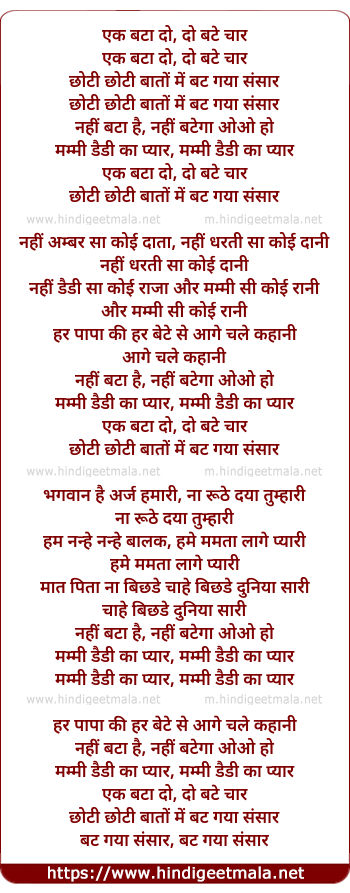 Lyrics of Ek Bata Do Do Bate Char, Choti Choti Baato Me Bat Gaya Sansaar - एक बटा दो, दो बटे चार छोटी छोटी बातो में बट गया संसार