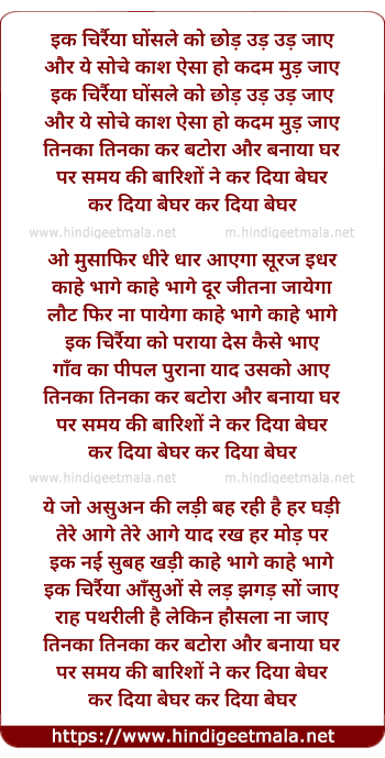 Lyrics of Ek Charraiya (Unplugged) - इक चिर्रैया घोंसले को छोड़ उड़ उड़ जाए