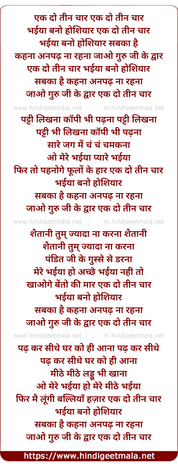 Lyrics of Ek Do Teen Char Bhaiya Bano Hoshiyar - एक दो तीन चार भईया बनो होशियार
