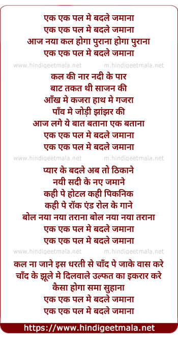 Lyrics of Ek Ek Pal Main Badle Zamana - एक एक पल मे बदले जमाना