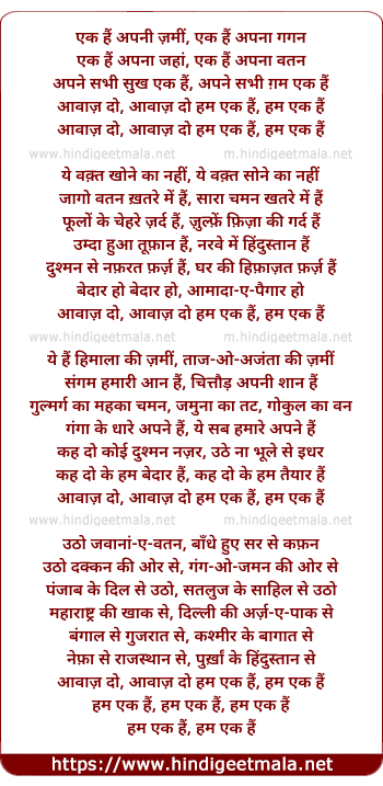 Lyrics of Ek Hai Apani Zamin, Aavaaz Do Ham Ek Hain - एक हैं अपनी ज़मीं, एक हैं अपना गगन