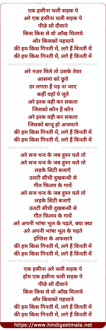 Lyrics of Ek Haseena Chali Sadak Pe - एक हसीना चली सड़क पे