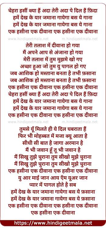 Lyrics of Ek Haseenaa Ek Deewana - एक हसीना एक दीवाना