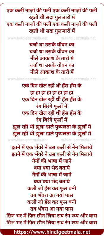 Lyrics of Ek Kali Nazon Ki Pali - एक कली नाज़ों की पली