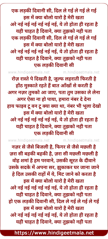 Lyrics of Ek Ladki Diwani Si - एक लड़की दिवानी सी