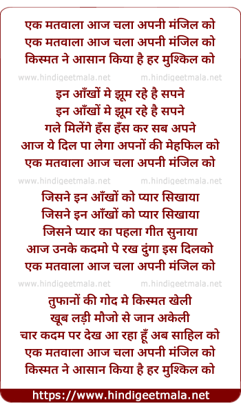 Lyrics of Ek Matwala Aaj Chala Apni Manzil Ko - एक मतवाला आज चला अपनी मंजिल को
