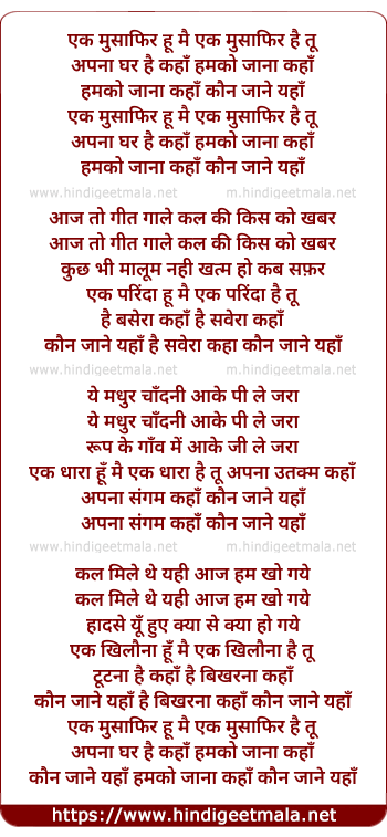 Lyrics of Ek Musafir Hu Main - एक मुसाफिर हूँ मैं
