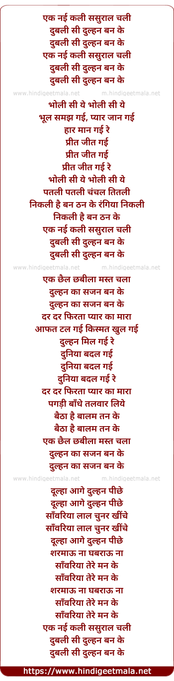 Lyrics of Ek Nayi Kali Sasural Chali - एक नई कली ससुराल चली