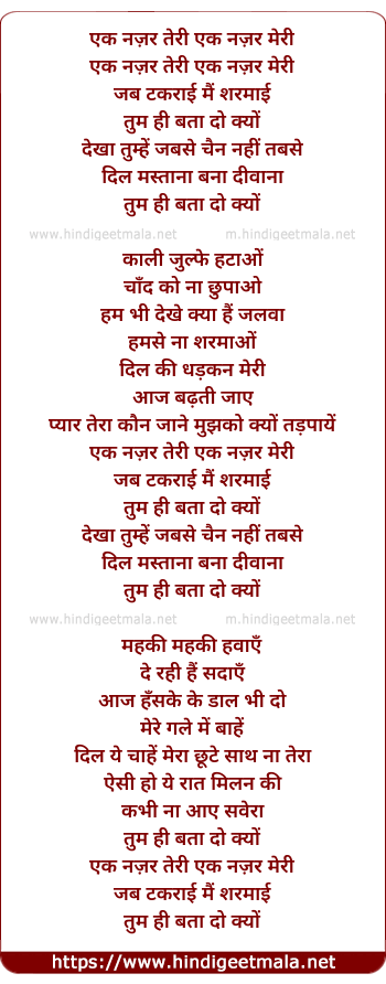 Lyrics of Ek Nazar Teri Ek Nazar Meri - एक नज़र तेरी एक नज़र मेरी
