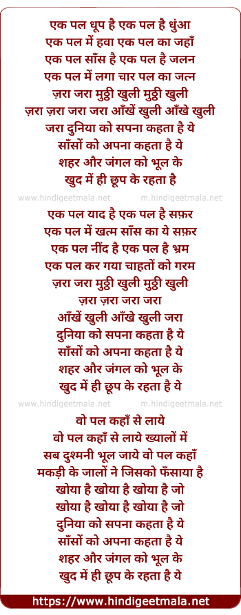 Lyrics of Ek Pal, Zara Zara - एक पल, ज़रा ज़रा