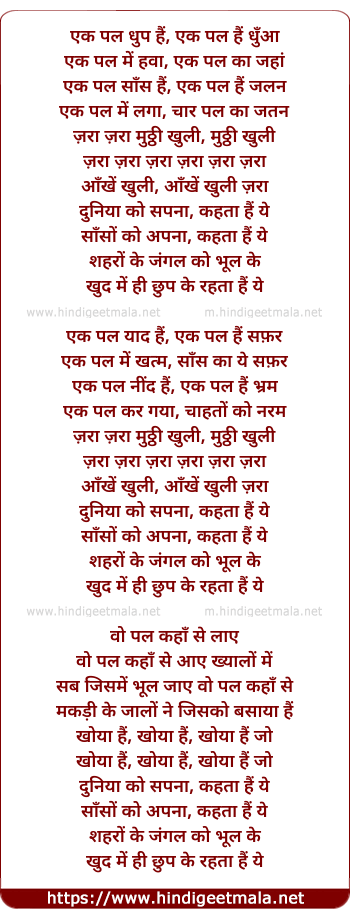 Lyrics of Ek Pal, Zara Zara (Shake) - एक पल धुप हैं, एक पल हैं धुँआ
