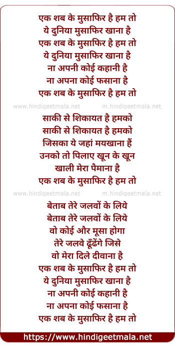 Lyrics of Ek Shab Ke Musafir Hai Hum To - एक शब के मुसाफिर है हम तो