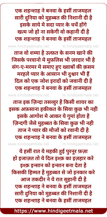 Lyrics of Ek Shahanshaah Ne Banavaa Ke Hasin Taajamahal - एक शहन्शाह ने बनवा के हसीं ताजमहल