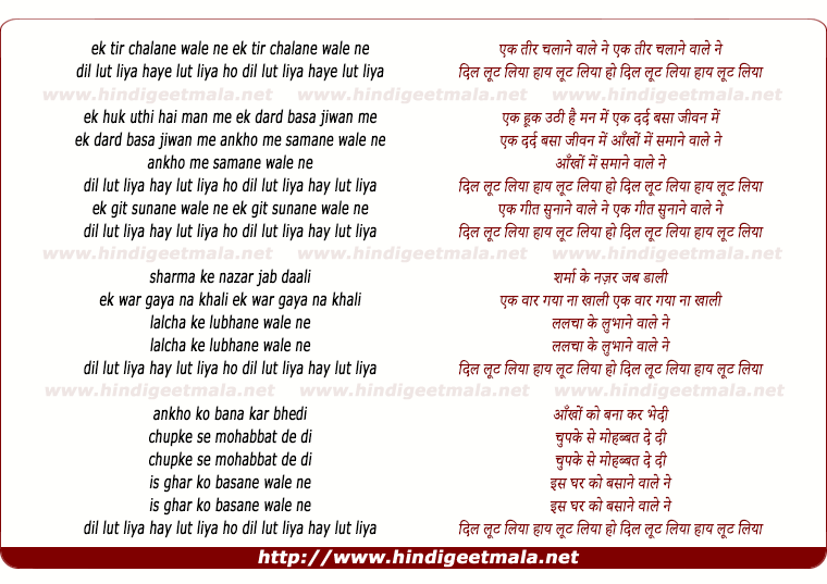 Lyrics of Ek Tir Chalane Waale Ne Dil Lut Liya - एक तीर चलाने वाले ने दिल लूट लिया