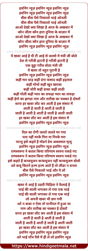 Lyrics of Evening News, Bees Bees Paise Nikalo Bhai - इवनिंग न्यूज़, बीस बीस पैसे निकालो भाई