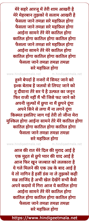 Lyrics of Faisla Jane Tamnna Sare Mehfil Hoga - फैसला जाने तमन्ना सरे महफ़िल होगा