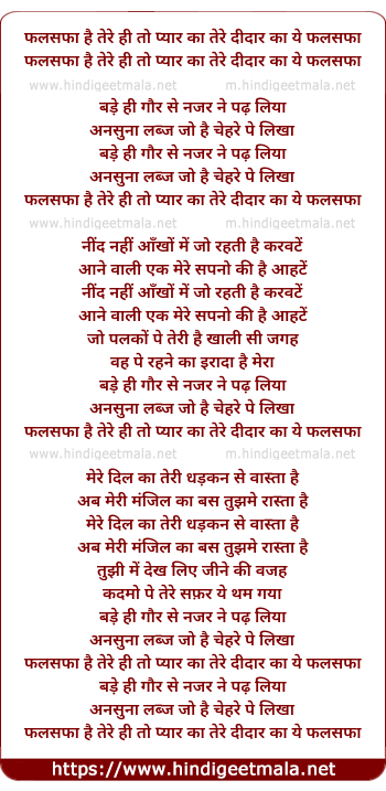 Lyrics of Falsafa Hai Tere Hi To Pyar Ka - फलसफा है तेरे ही तो प्यार का
