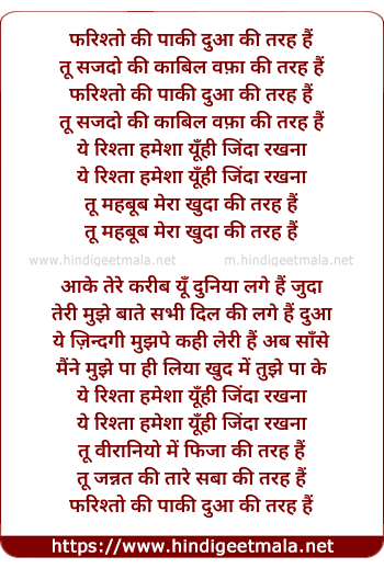 Lyrics of Farishton Ki Dua (Angels Orar) - फरिश्तो की पाकी दुआ की तरह हैं
