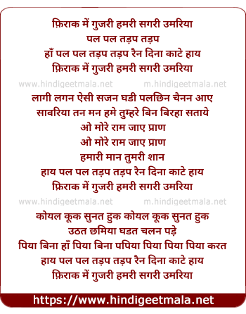 Lyrics of Firak Me Guzri Hamri Sagri Umariya - फ़िराक में गुजरी हमरी सगरी उमरिया