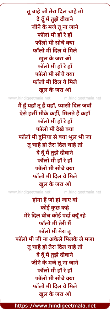 Lyrics of Follow Me (Kismetwala) - तू चाहे जो तेरा दिल चाहे तो