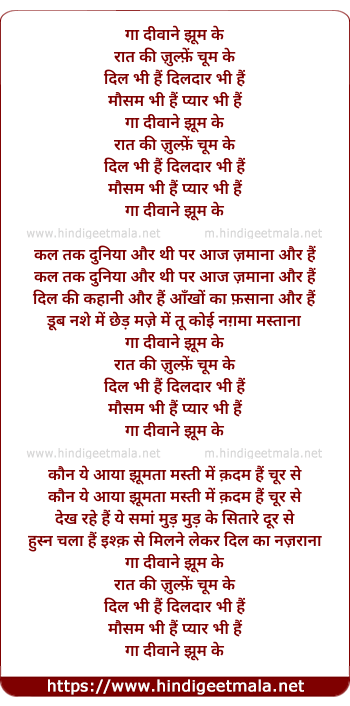 Lyrics of Gaa Divaane Jhum Ke, Raat Ki Zulfe Chum Ke - गा दीवाने झूम के, रात की ज़ुल्फ़ें चूम के