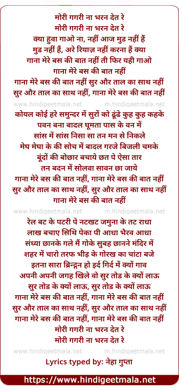 Lyrics of Gana Mere Bas Kee Bat Nahee - मोरी गगरी ना भरन देत रे