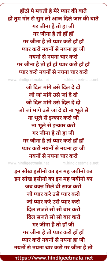 Lyrics of Gar Jina Hai To Pyar Karo Ji - होंठो पे मचती है मेरे प्यार की बाते