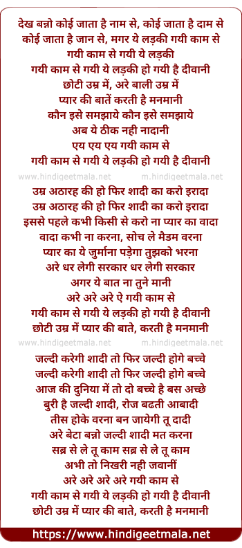 Lyrics of Gayi Kaam Se Gayi Yeh Ladaki - गयी काम से गयी ये लड़की