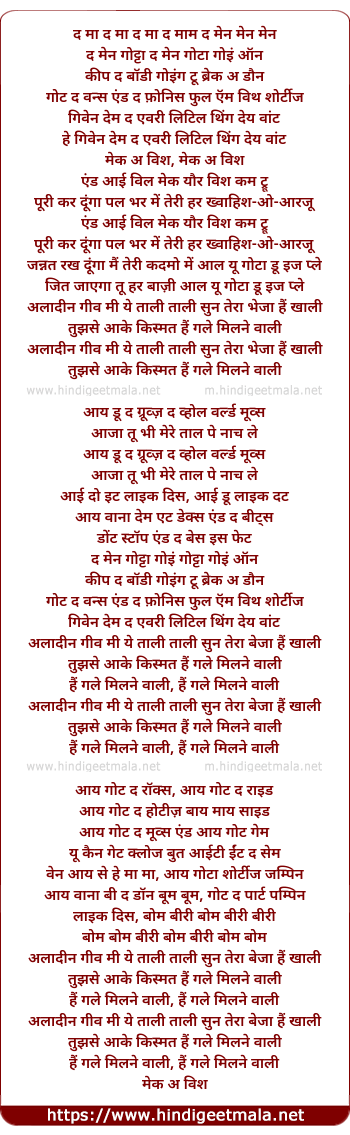 Lyrics of Aladin Give Me Ye Tali Tali - अलादीन गीव मी ये ताली ताली