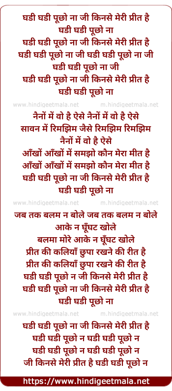 Lyrics of Ghadi Ghadi Puchho Na Ji Kinse Meri Prit Hai - घड़ी घड़ी पूछो ना जी किनसे मेरी प्रीत है