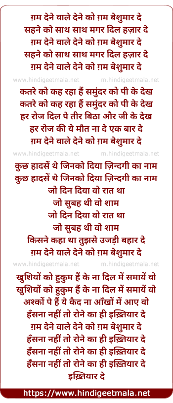 Lyrics of Gham Dene Wale Dene Ko - ग़म देने वाले देने को