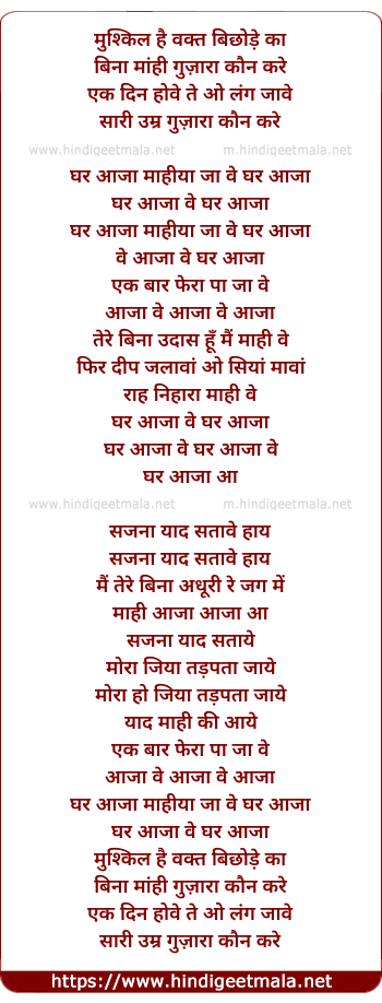 Lyrics of Ghar Aajaa - मुश्किल है वक्त बिछोड़े का