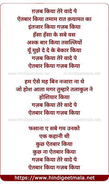 Lyrics of Ghazab Kiya Tere Vaade Pe Aitbaar Kiya - ग़ज़ब किया तेरे वादे पे