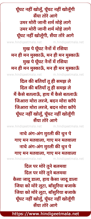 Lyrics of Ghoonghat Nahi Kholungi Saiyaan Tore Aage - घूँघट नहीं खोलूँगी सैंया तोरे आगे