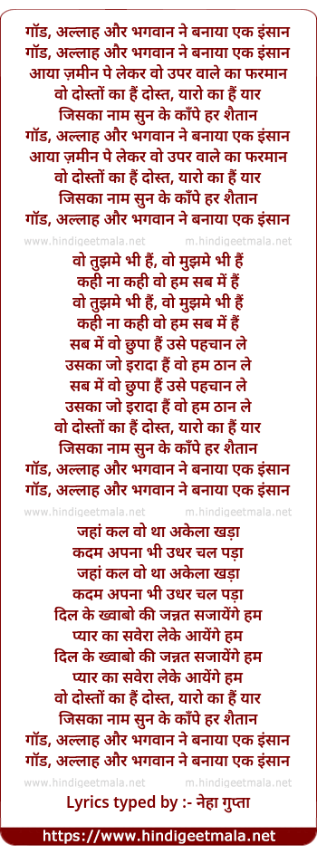 Lyrics of God Allah Aur Bhagwan Ne Banaya Ek Insaan - गॉड अल्लाह और भगवान ने बनाया एक इंसान