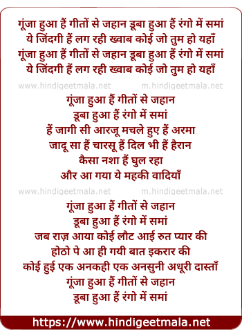 Lyrics of Gunja Hua Hai Gito Se Jahan, Duba Hua Hai Rango Me Sama - गूंजा हुआ हैं गीतों से जहान, डूबा हुआ हैं रंगो में समां