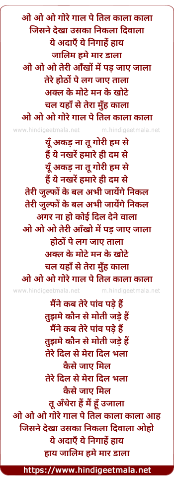 Lyrics of Gore Gaal Pe Til Kala Kala - गोरे गाल पे तिल काला काला