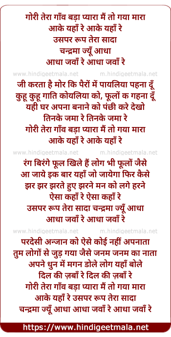 Lyrics of Goree Teraa Ganv Bada Pyara - गोरी तेरा गाँव बड़ा प्यारा