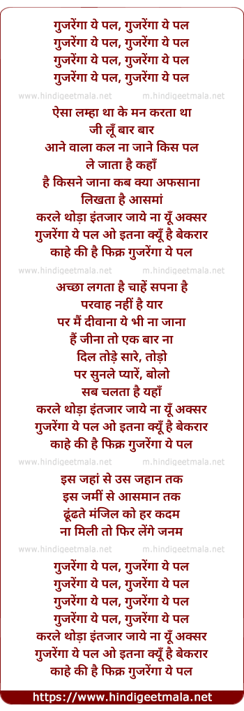 Lyrics of Gujrega Ye Pal Gujrega Ye Pal - गुजरेंगा ये पल गुजरेंगा ये पल