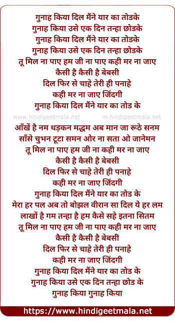 Lyrics of Gunaah- Theme - गुनाह किया दिल मैंने यार का तोडके