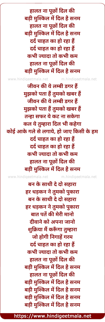 Lyrics of Haalat Naa Puchho Dil Kee - हालत ना पूछों दिल की