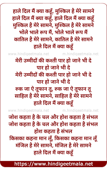 Lyrics of Haale Dil Mai Kya Kahu, Mushkil Hai Mere Saamane - हाले दिल मैं क्या कहूँ, मुश्किल है मेरे सामने