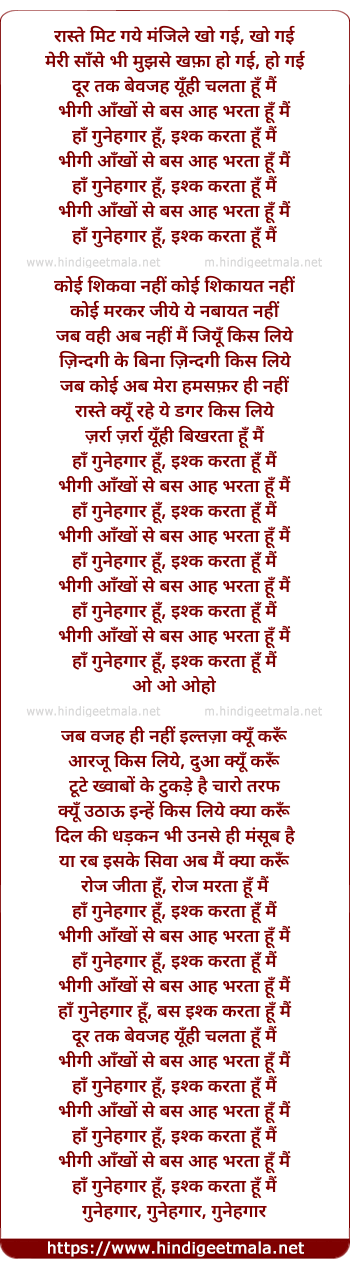 Lyrics of Haan Gunahgaar Hun Ishq Karta Hun Main - रास्ते मिट गये मंजिले खो गई, खो गई