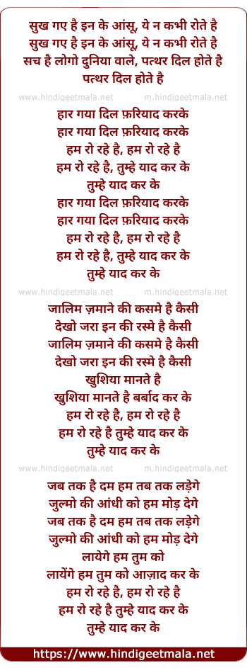 Lyrics of Haar Gaya Dil Fariyad Karke - हार गया दिल फ़रियाद करके