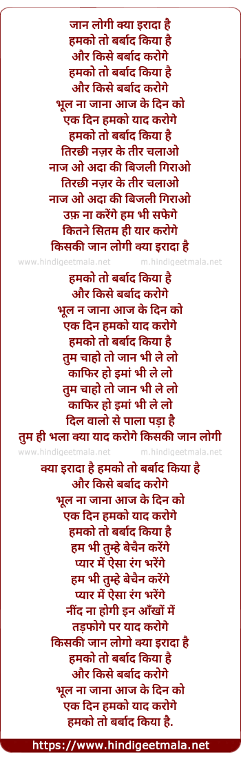 Lyrics of Haaye Kiski Jaan Loge Humko To Barbaad Kiya Hai Aur Kise Barbaad Karoge (Male) - हाय किसकी जान लोगे हमको तो बर्बाद किया है और किसे बर्बाद कारोंगे