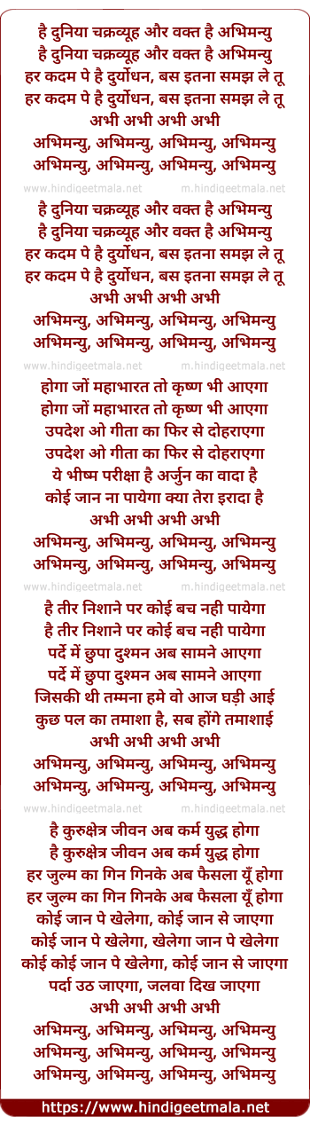 Lyrics of Hai Duneeya Chakravyuh, Aur Wakt Hai Abhimanyu - है दुनिया चक्रव्यूह, और वक्त है अभिमन्यु