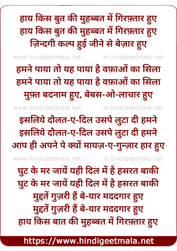 Lyrics of Hai Kis Boot Ki Mohabbat Me - हाय किस बुत की मुहब्बत में गिरफ़्तार हुए