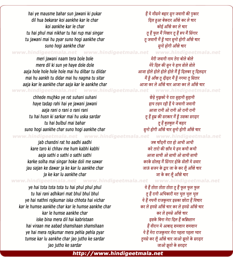 Lyrics of Hai Ye Mausam-E-Bahar, Sun Jawani Ki Pukar - हैं ये मौसम-ए-बहार सुन जवानी की पुकार
